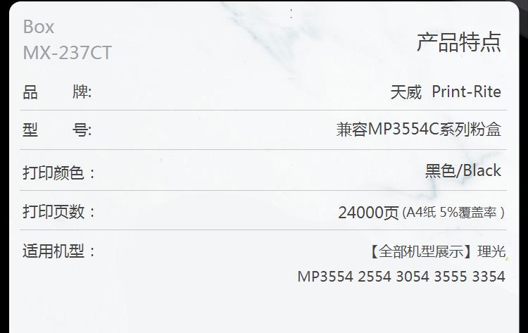 商品名称:天威 RICOH-MP3554C-700G-黑色复粉粉盒 经典装 适用于理光MP3554/2554/3054/3555/3354