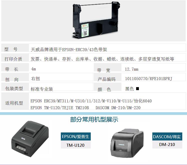 商品名称:天威 EPSON-ERC39/43-4m,12.7mm-黑色右扭架 用于ERC39/MT311/M-U310 TM-U120/TEJIE TM210B DM-210/DASCOM DM-220
