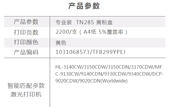 商品名称:天威 BROTHER-TN285-黄粉盒 专业装 适用于兄弟HL-3140CW/3150CDW/3150CDN MFC-9130CW/9140CDN/