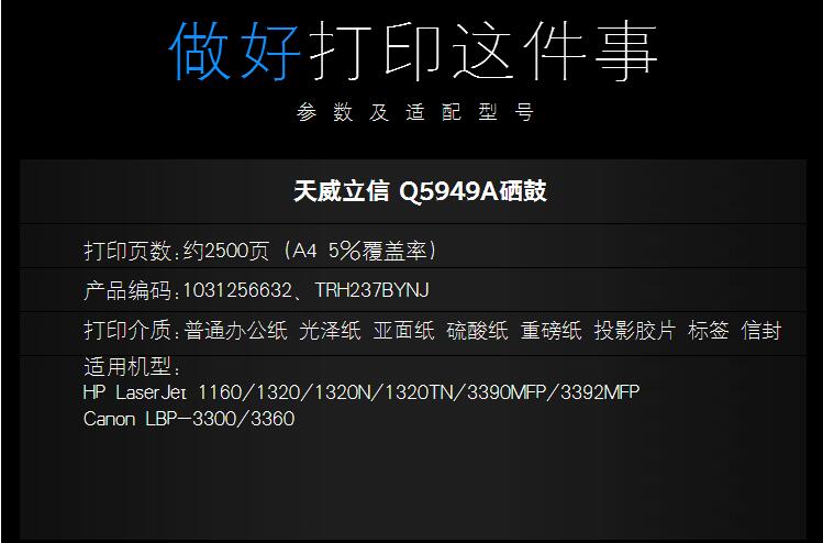 商品名称:天威立信HP-Q5949A/CANON-308-黑色通用硒鼓 适用于LaserJet 1160/1320/1320N/1320TN/3390MFP/3392MFP LBP-3300/3360 立信装