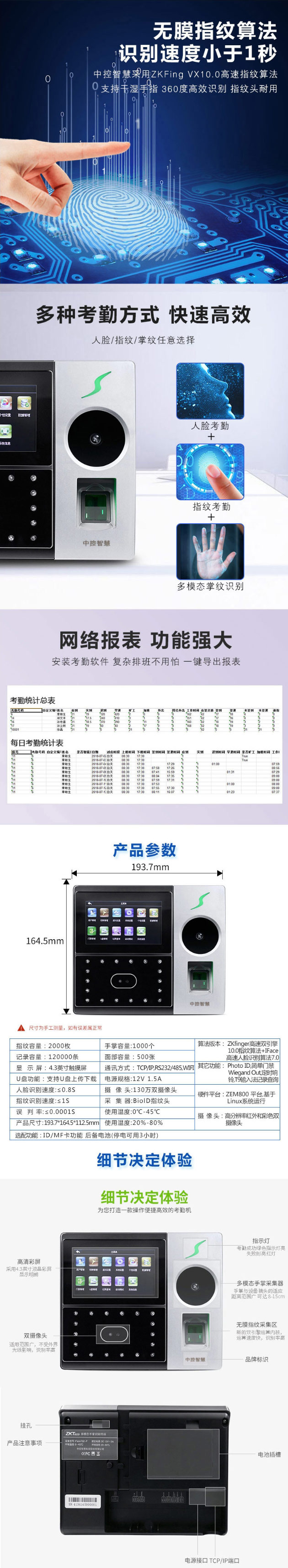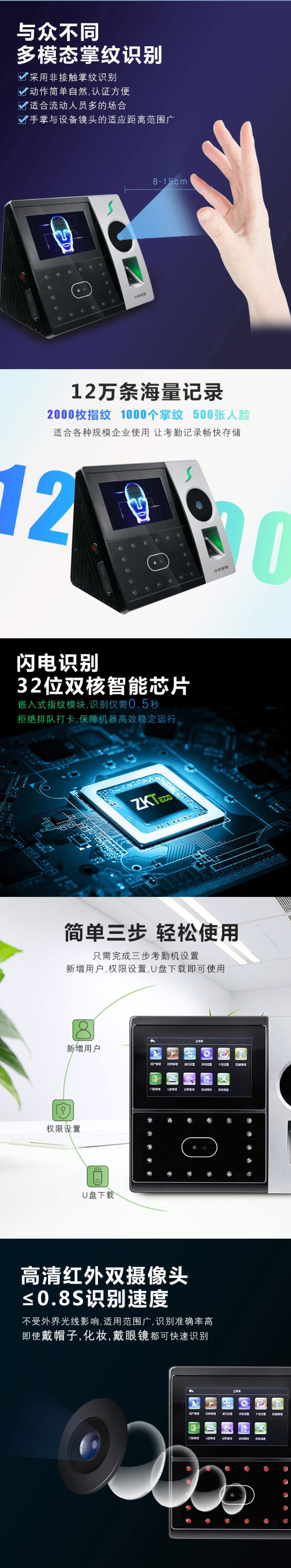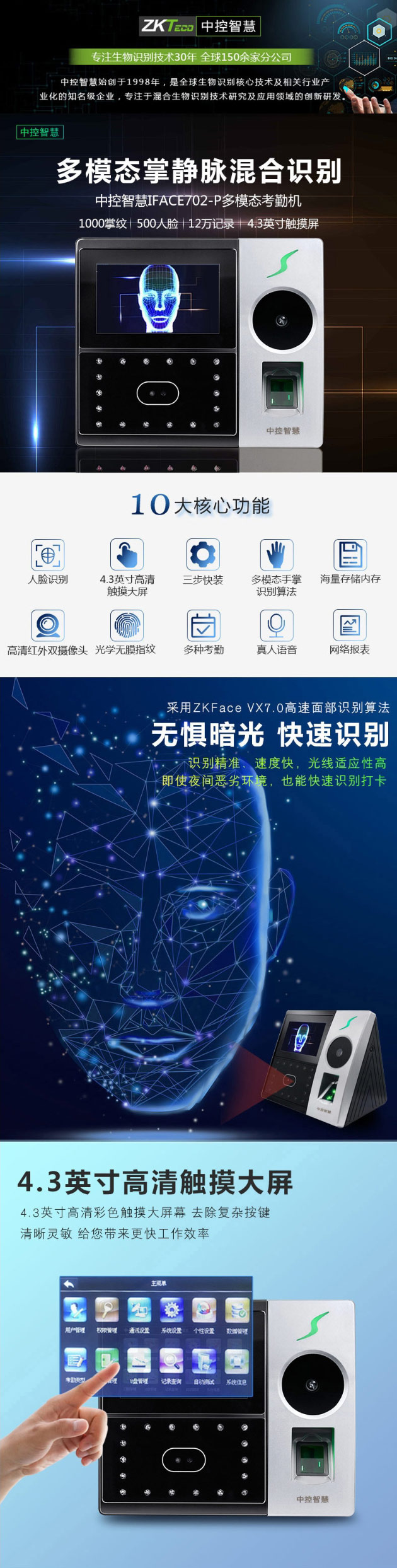 商品名称:中控智慧(ZKTeco)iFace702-P 掌纹/人脸/指纹混合识别考勤机 智能WIFI无接触高速打卡签到机