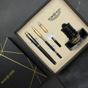 英雄(HERO)1802 铱金钢笔/宝珠笔/美工笔三合一签字笔墨水礼盒套装 黑色