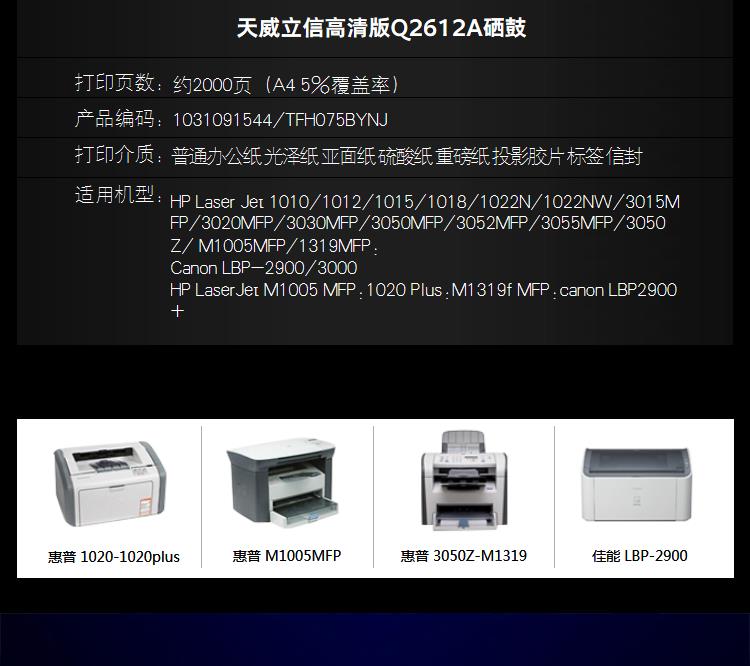 商品名称:天威立信 Q2612A/CRG303硒鼓 适用HPm1005mfp 1020 plus 1015 3050 LBP2900+ 3000 打印机硒鼓 墨盒