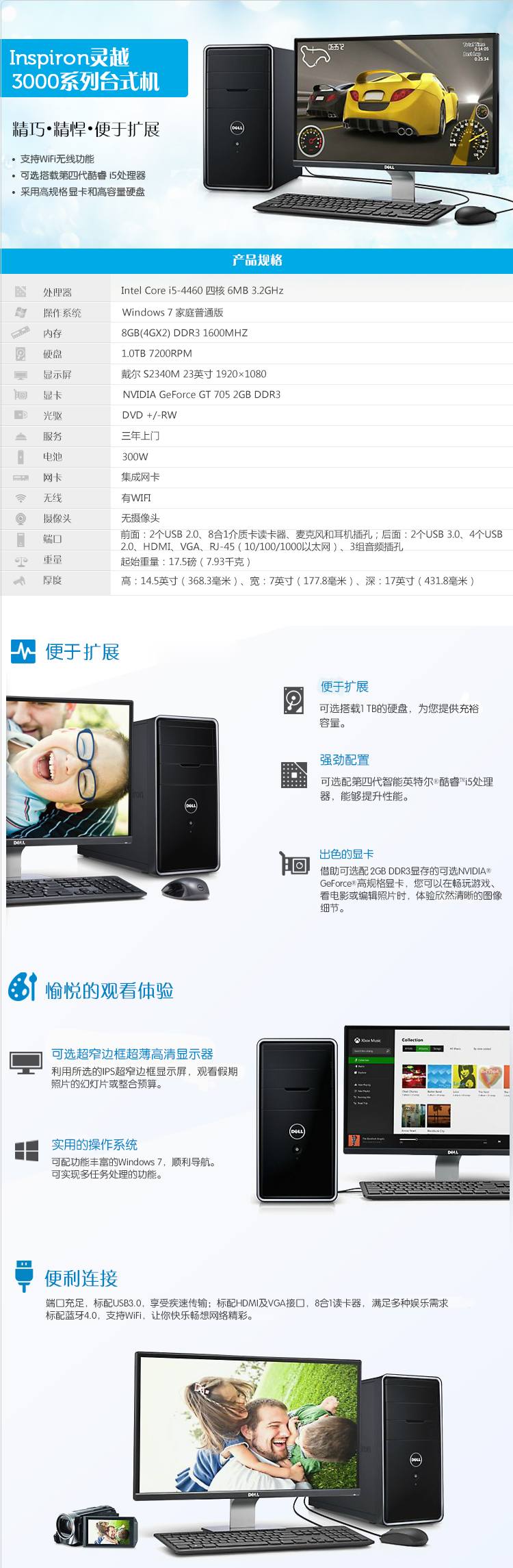 商品名称:戴尔(DELL)Inspiron 3847-R7938 灵越台式电脑 (i5-4460 8G 1TB 2G独显 WIFI D刻 三年上门 Win7)黑