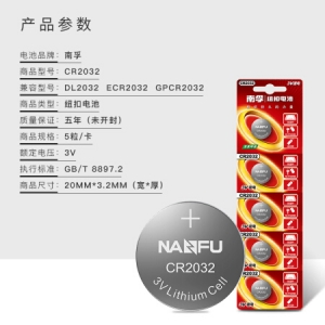- 商品名称:南孚(NANFU) CR2032 纽扣电池 3V 5粒/卡