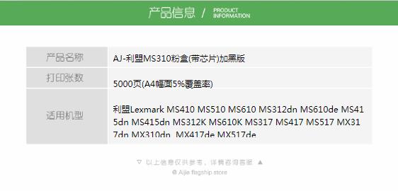 商品名称:艾洁 利盟 MS310 粉盒(带芯片)加黑版50F3H0E 适用Lexmark MS310 MS410 MS510 MS610 MS312dn MS610de MS415dn