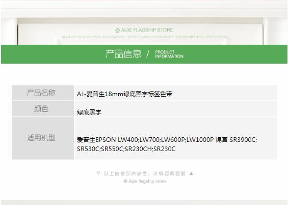 商品名称:艾洁 爱普生 18mm绿底黑字标签色带 适用EPSON LW400;LW700;LW600P;LW1000P LK-5GBP
