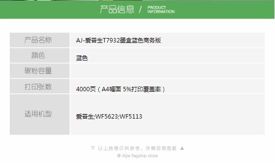 商品名称:艾洁 爱普生 T7932 墨盒蓝色商务版 适用WF5113 5623 5693机型