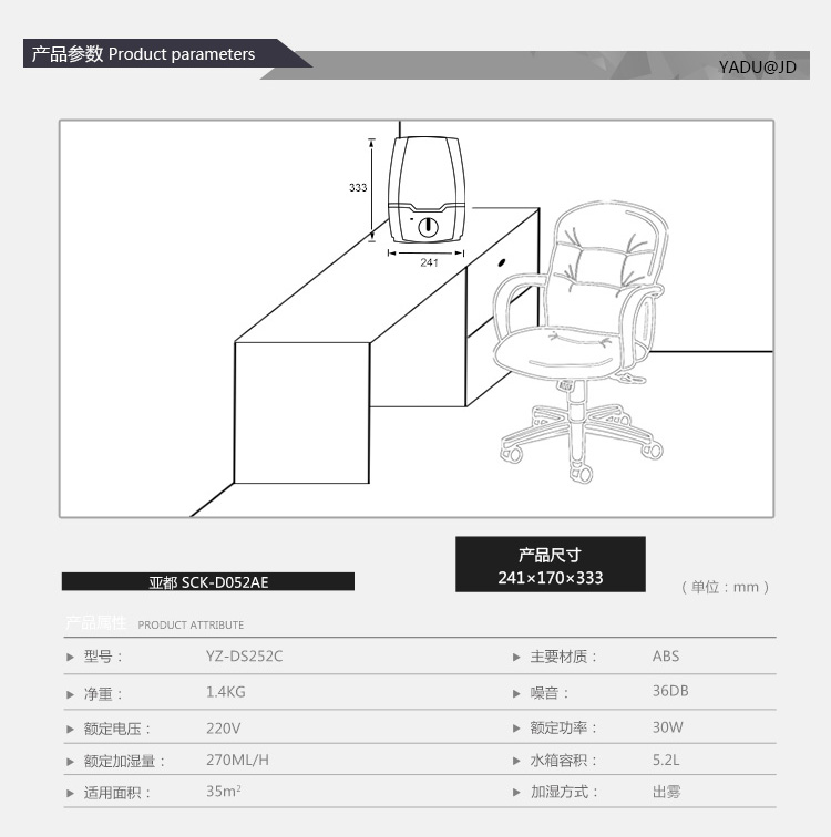 商品名称:亚都(YADU)SC-D052AE 超声波加湿器