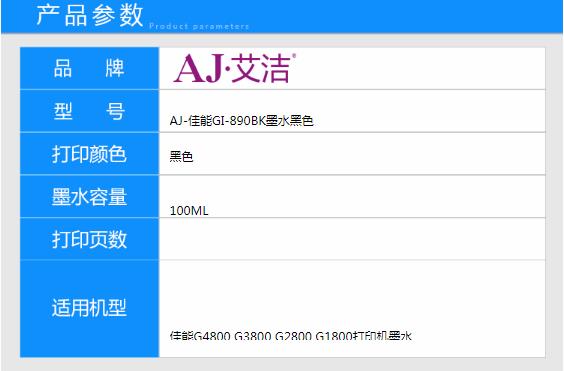 商品名称:艾洁 佳能 GI-890BK 墨水黑色 适用佳能G4800 G3800 G2800 G1800打印机墨水