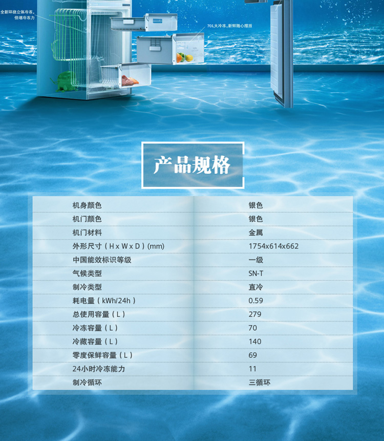 商品名称:西门子(SIEMENS)KG28FA2SPC 279升 三门冰箱 绿色零度保鲜(拉丝银)BCD-279(KG28FA2SPC)