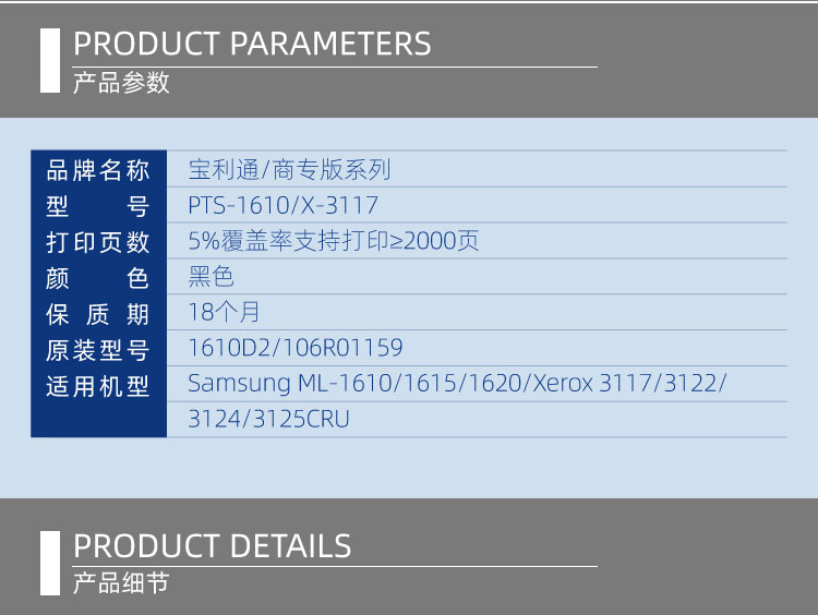 - 商品名称:宝利通(商专版系列)PTS-1610/X-3117 硒鼓 适用Samsung ML-1610/1615/1620/Xerox 3117/3122/3124/3125CRU