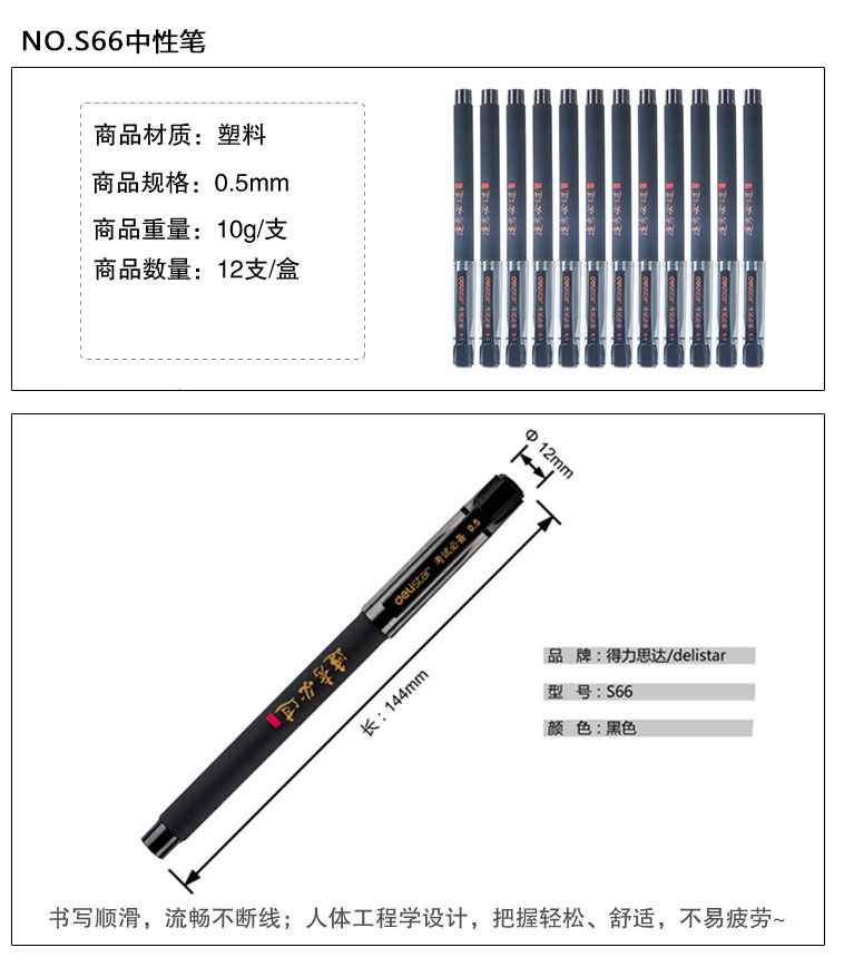 商品名称:得力(deli )S66黑色中性笔 12支装 0.5mm 办公学生用品